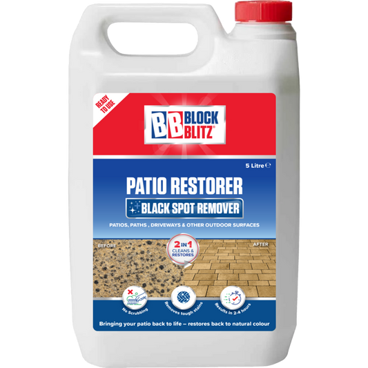 Block Blitz Patio Restorer & Black Spot Remover 5LUp to 25m2 coverage.|Works within 2 to 4 hours.|Perfect for cleaning patios, pathways, driveways & more.|Removes even the toughest dirt and grime, restoring your patio to its original beauty.|Easy to use - No need for scrubbing or power washing.