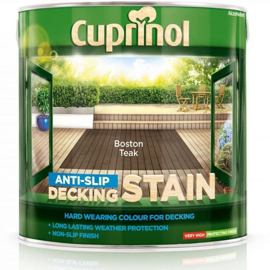 Cuprinol Anti-Slip Decking Stain 2.5L American MahoganyAll surfaces should be pre swept with a stiff brush or broom to remove all surface dirt, debris and other surface contaminates.|Remove any algae, lichen or moss using an appropriate decking cleaner.|Wood that has been previously stained, painted or varnished should be stripped back...