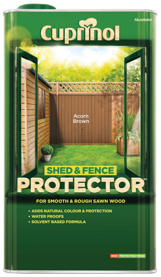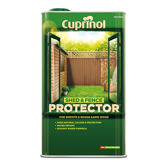Cuprinol Shed & Fence Protector 5L Golden BrownEnsure that wooden surface is clan, dry and free from dust, dirt and any other surface contaminates.|Shake the tin well before use to achieve uniform colour. |Apply 2-3 uniform coats with a brush.|Apply the second coat after the first has soaked in.|Protect plants and...