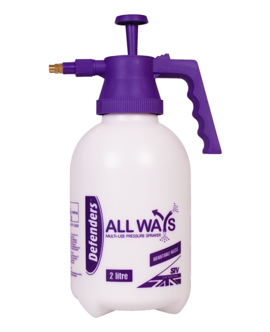 Defenders Pressure Sprayer 2LPump-action pressure sprayer with adjustable spray nozzle and trigger lock.