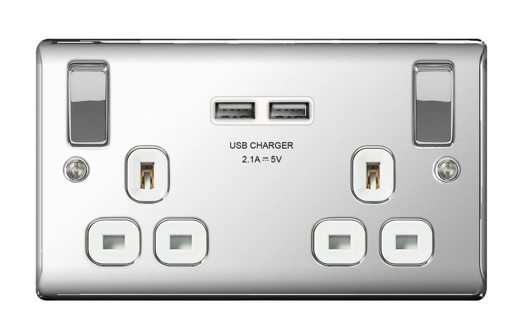 BG 13a 2 Gang Switch Socket & USB Brushed Steel With White Inserts