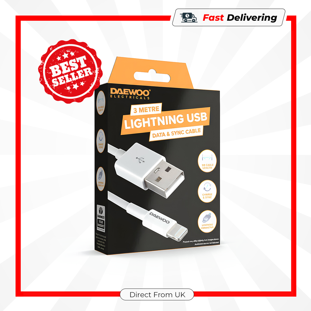 Stay powered with the Daewoo 3m USB-A to 8 Pin Lightning Cable 2A. Designed for Apple devices, it delivers ultra-fast 5V 2.1A charging while allowing use with phone cases. Perfect for home, office, or travel, this durable cable ensures reliable charging and data transfer every time.