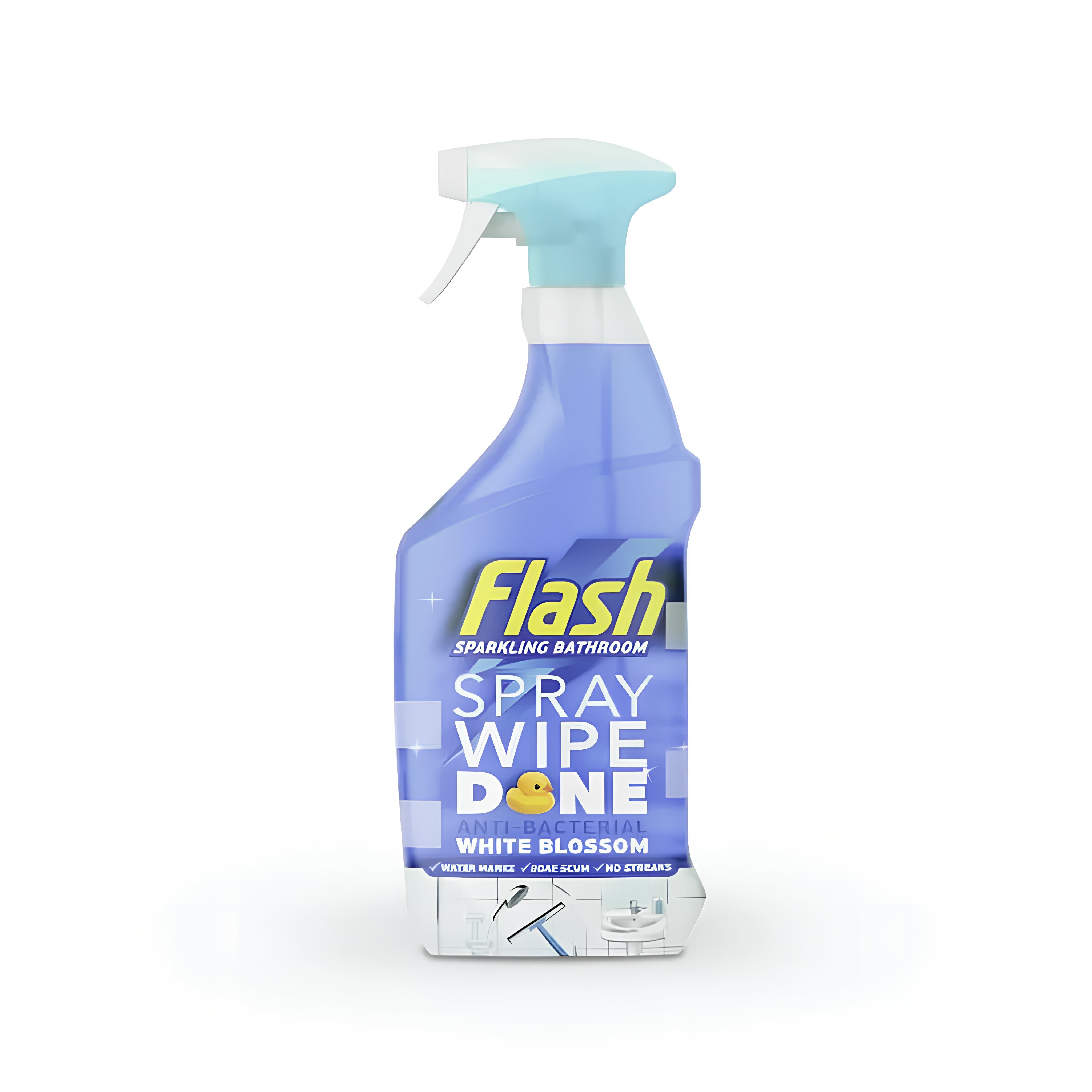 Keep your bathroom sparkling clean with Flash Spray Wipe Done Bathroom Spray. Slim and easy to use, this 800ml spray cleans, disinfects, and leaves a fresh White Blossom scent. Perfect for sinks, tiles, and surfaces, it quickly removes dirt, soap scum, and grime, making bathroom cleaning effortless and hygienic.
