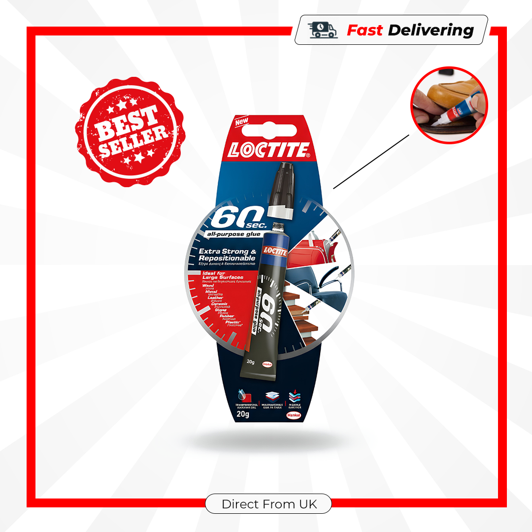 Tackle all your home repairs quickly and effortlessly with Loctite 60 Seconds All-Purpose Glue! Bond small to large surfaces in just 60 seconds with this extra-strong, fast-drying adhesive. Ideal for wood, metal, plastic, ceramics, and more, its non-drip gel formula makes vertical and tricky applications easy. Reposition parts within 40 seconds and enjoy a clear, strong finish that holds up to 100 kg/m² in 24 hours. Perfect for DIY projects, crafts, and everyday household fixes.