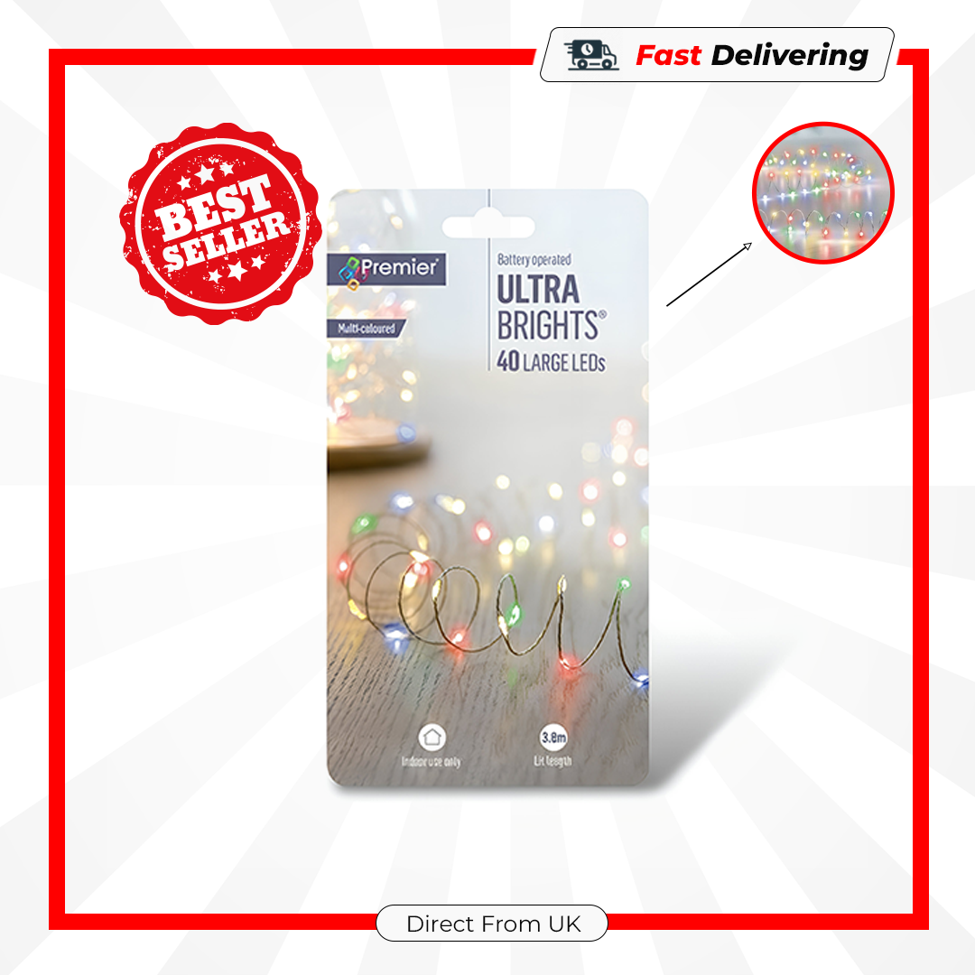 The Premier 40 LED Indoor Ultrabrights featuring vibrant multi-coloured lights on a sleek silver wire bring a cheerful glow to your festive décor. Perfect for adding sparkle to mantels, wreaths, or table settings, these lights create a joyful and modern Christmas atmosphere with effortless style.