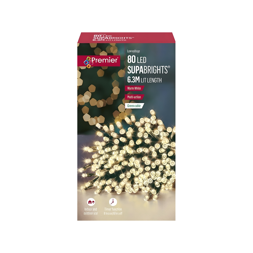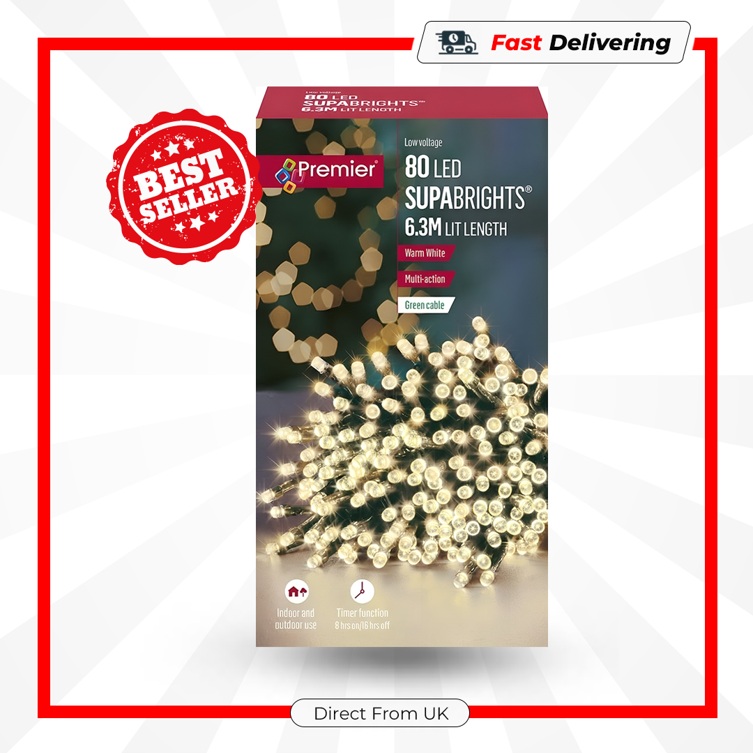 Bring a magical glow to your home this festive season with the Premier 80 LED Supabrights Warm White Lights. These stunning lights feature a built-in timer and multi-action settings, making them the perfect choice for effortless Christmas decorating. Designed for indoor use, they add warmth, elegance, and holiday charm to any space — ideal for trees, garlands, or window displays.
