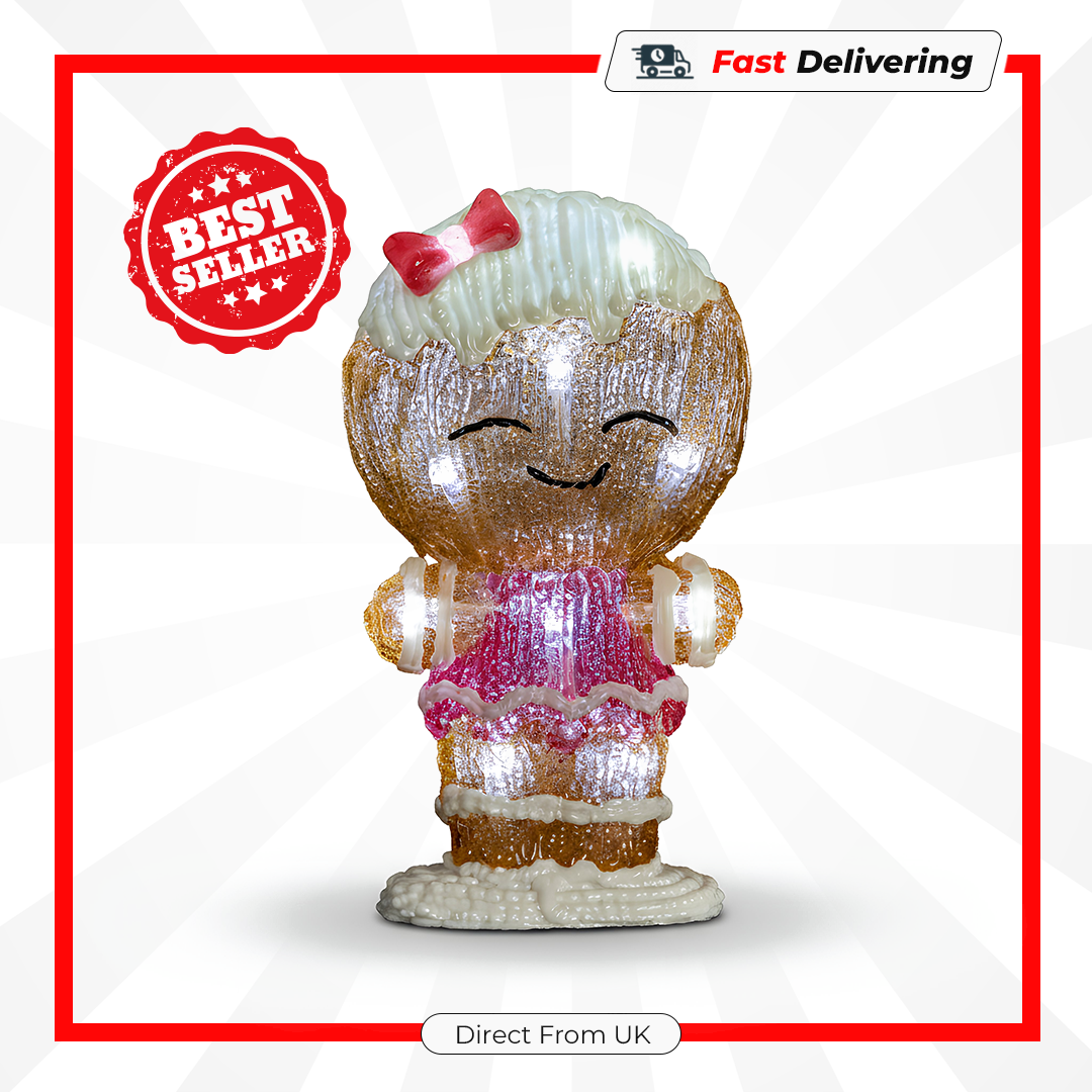 Add festive charm to your home this holiday season with the Premier Lit Gingerbread Girl. Battery-operated and glowing with 16 bright white LEDs, this acrylic decoration brings warmth, joy, and a magical Christmas spirit to any tabletop or display. Perfect for creating a cozy, cheerful atmosphere for family gatherings or as a thoughtful gift.