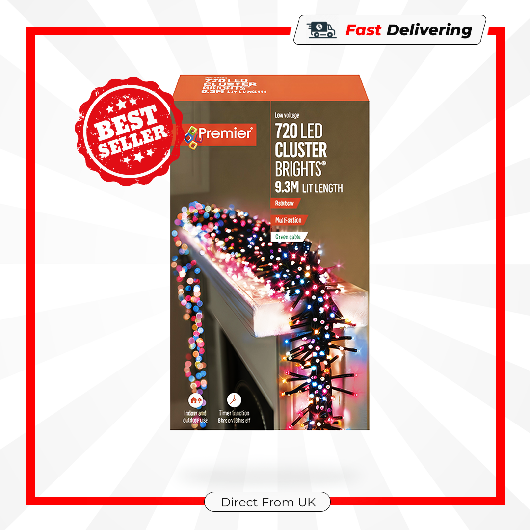Bring a stunning festive glow to your home with the Premier 720 LED Cluster Brights. These vibrant rainbow lights create a full, eye-catching sparkle that instantly lifts any Christmas display. With multi-action settings and a built-in timer, they’re effortless to use and perfect for adding warmth and colour both indoors and outdoors.