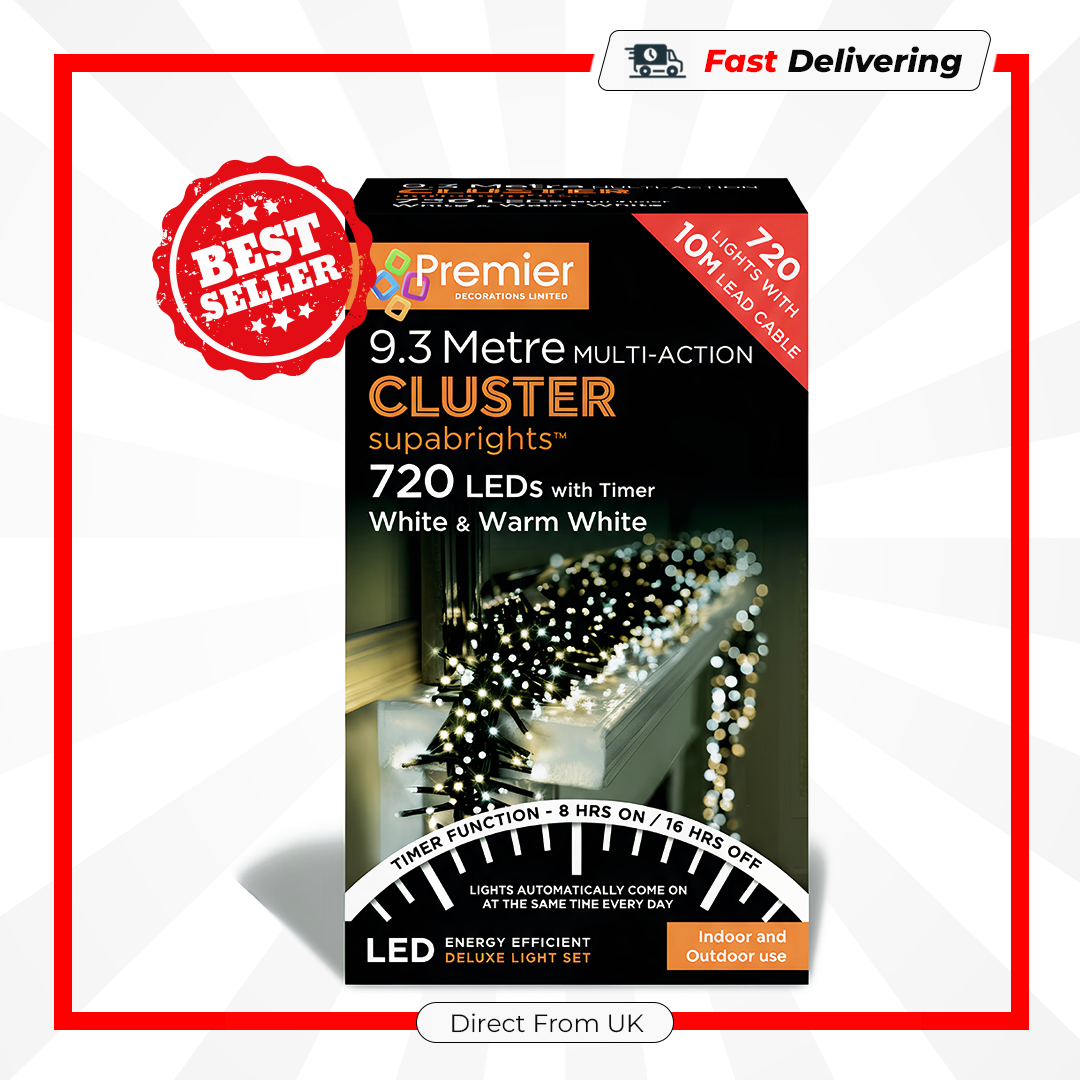 The Premier 720 LED Supabrights Cluster Lights combine brightness and style for a stunning festive display. Featuring crisp white and warm white LEDs, multi-action modes, and a convenient timer, these lights bring effortless sparkle and atmosphere to your Christmas décor, perfect for trees, garlands, or indoor and outdoor setups.