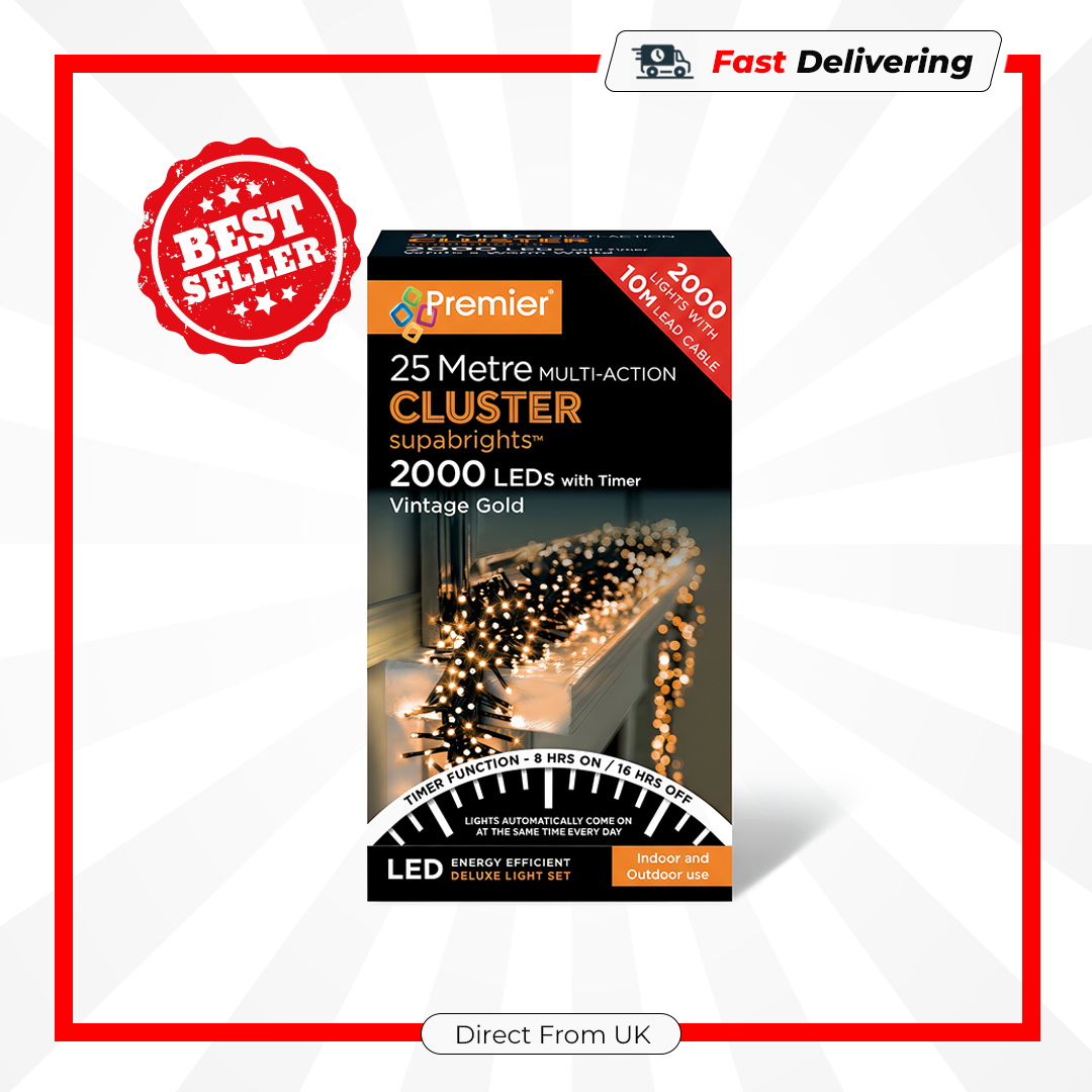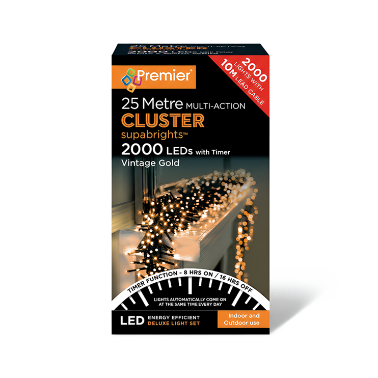 The Premier 2000 LED Multi Action Supabrights Cluster Lights featuring a luxurious Vintage Gold glow on a subtle Green Cable bring timeless warmth and elegance to your Christmas décor. With 2000 sparkling LEDs and multiple light functions, these cluster lights create a rich festive glow that transforms any space into a cozy, magical setting — perfect for trees, garlands, or outdoor displays.