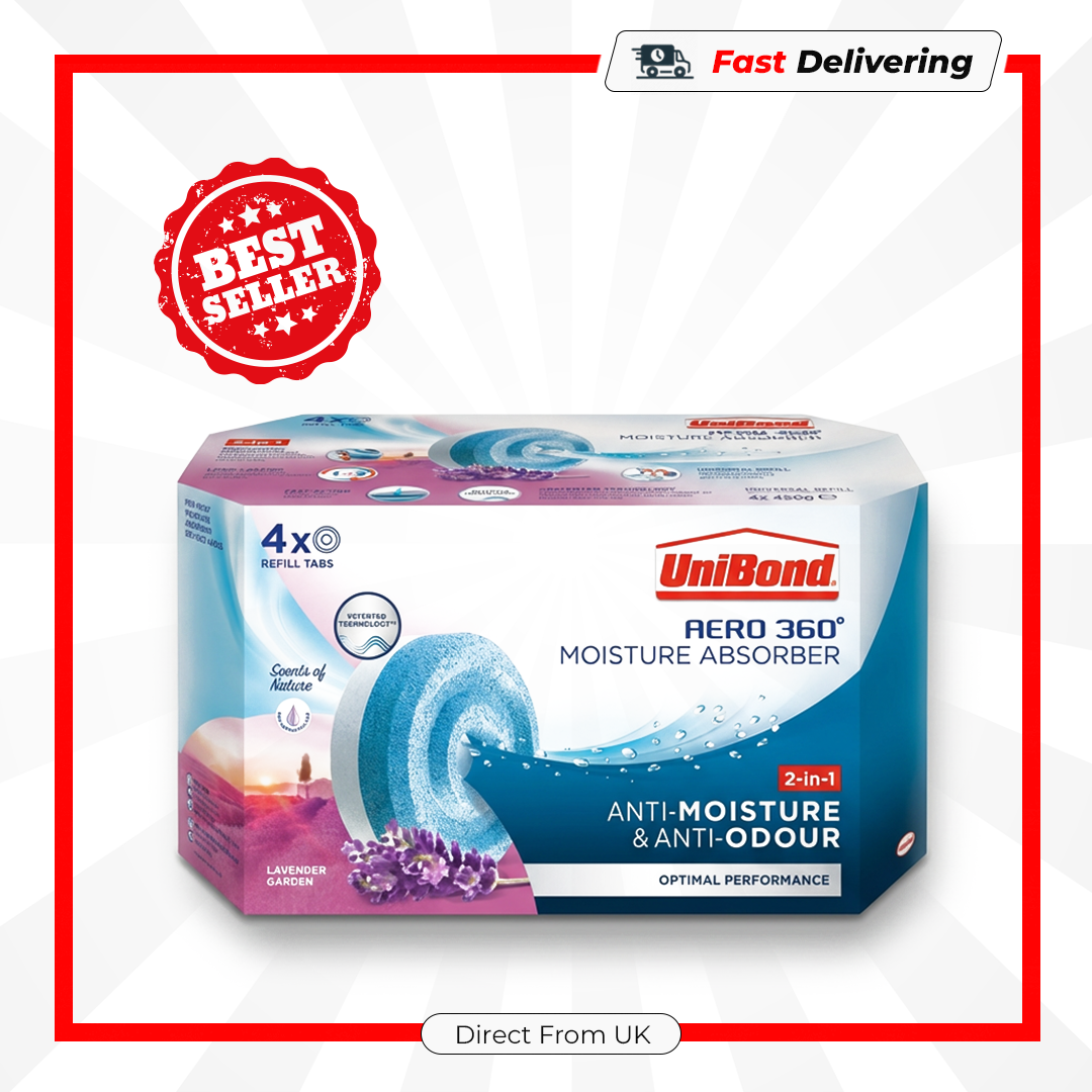 Refresh your home while protecting it from damp with UniBond AERO 360° Lavender Garden refills. These powerful moisture-absorbing tabs work continuously to reduce excess humidity, eliminate unpleasant odours, and release a calming lavender fragrance—keeping your space feeling clean, dry, and welcoming every day.